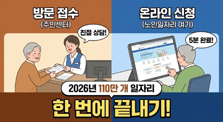 2026년 역대 최대 규모인 110만 개의 노인 일자리가 쏟아지고 있습니다. "어디서 신청하는지 몰라서" 혹은 "절차가 복잡해서" 기회를 놓치시는 일이 없도록, 방문 접수와 온라인 신청을 한 번에 끝내는 핵심 가이드를 준비했습니다.