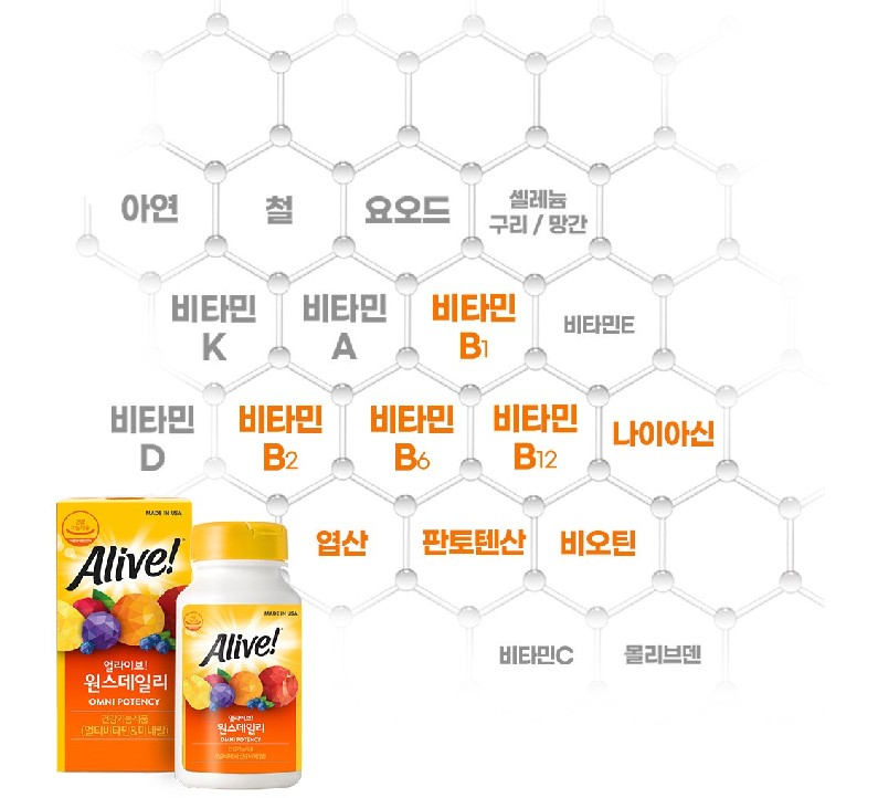 얼라이브 원스데일리 멀티비타민은 21가지 비타민과 미네랄, 에너지 생성 고함량 비타민 B군 등을 함유한 종합비타민으로 한국인에 맞게 기능성과 안정성을 인정 받은 제품입니다. 한 알에 꽉 채운 온 가족 종합 비타민 얼라이브 원스데일리는 충분한 영양섭취가 필요한 수험생, 생기있는 하루를 만들고 싶은 분, 아침에 일어나기 힘든 분 등에 효과적인 종합비타민입니다.