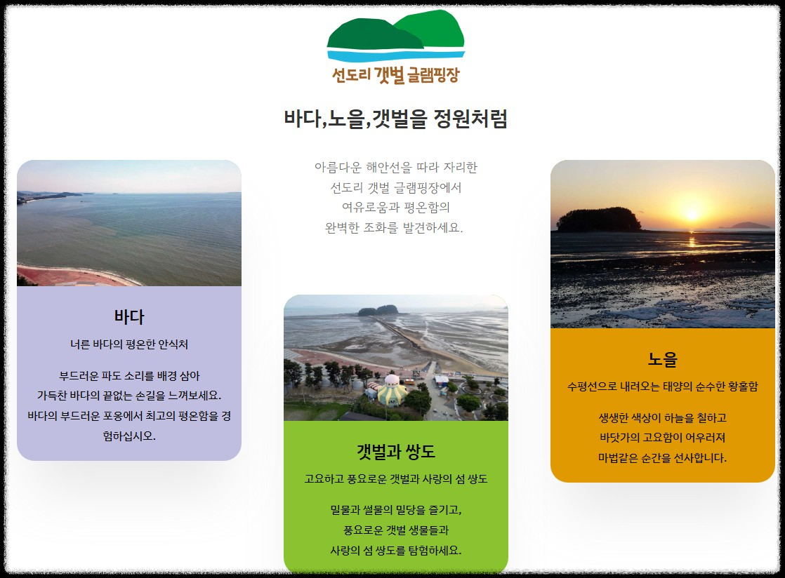 아름다운 해안선을 따라 자리한 선도리 갯벌 글래핑장은 여유로움과 평온함을 느낄 수 있는 곳으로 파도 소리와 수평선으로 내려오는 노을의 황홀함을 만끽할 수 있습니다.