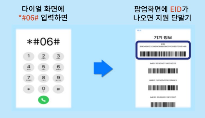 - 다이얼 화면에 #06# 입력하면 팜업화면에 EID가 나오면 지원 단말기