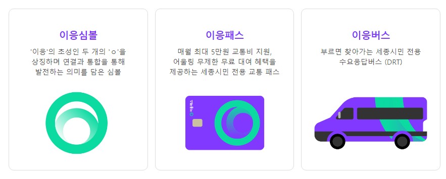 이동에 응답하다라는 의미의 이응은 세종 시민의; 일상 이동을 스마트하고 편리하게 만들어주는 통합 교통 서비스로 매월 최대 5만원 교통비 지원, 어울림 무제한 대여 혜택을 제공하는 세종시민 전용 교통 패스입니다.