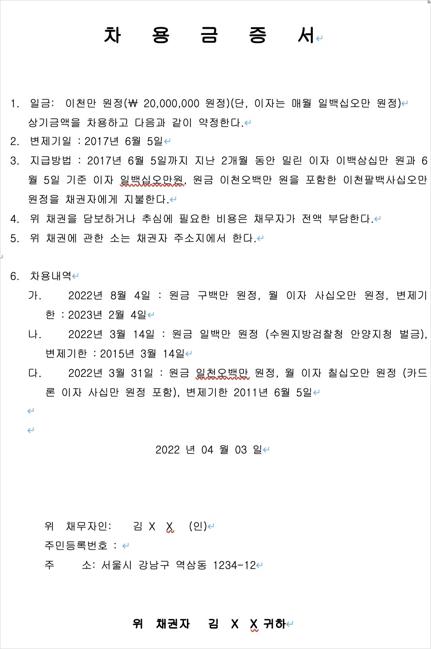 - 차용증 작성일 기재: 차용증을 작성한 날짜를 기재합니다.