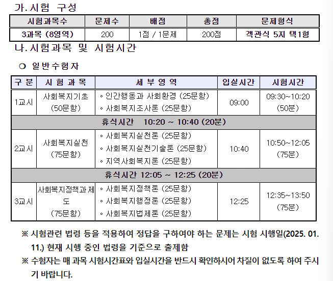 보건복지부는 10월 11일 사회복지사업법 시행령 제3조 제3항 규정에 따라 2025년도 제23회 사회복지사 1급 국가 자격시험 시행계획을 공고한다고 밝혔습니다. 2025년도 사회복지사 1급 국가시험은 2025년 1월 11일 이며 최종 합격자 발표는 2025년 3월 20일입니다.