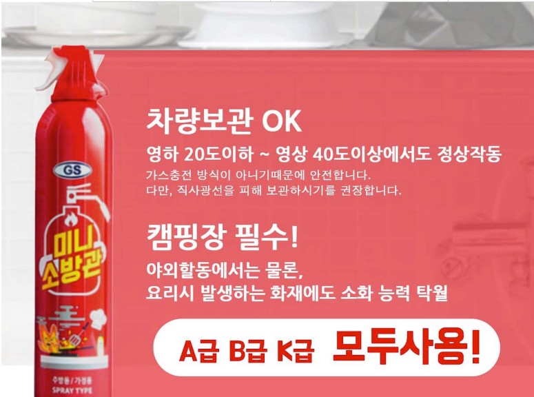 지에스켐 미니소방관 차량용 소화기는 자동차 화재, 캠핑 등 야외활동에서는 물론 요리시 발생하는 소화 능력이 탁월합니다.