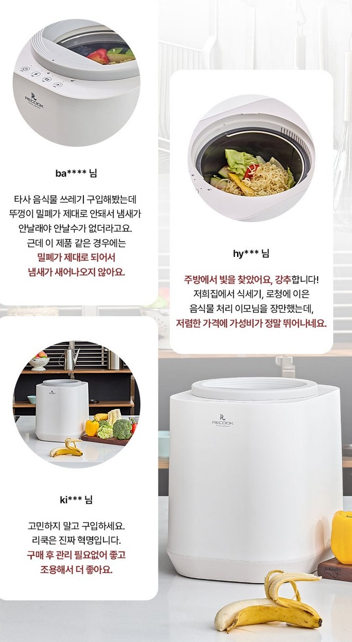 리쿡 음식물 처리기는 고온 건조 분쇄 방식으로 저렴한 가격에 가성비가 뛰어난 음식물 처리기입니다. 고객 만족도가 99%에 달하며 출시 5달만에 평점 4.85을 받았습니다. 가전에서는 나올 수 없는 평점으로 시장에서 인정받았습니다.