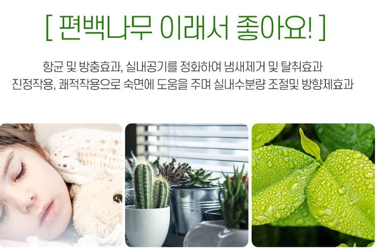 편백나무는 항균 및 방충효과, 실내공기를 정화하여 냄새제거 및 탈취효과가 뛰어나고 진정작용, 쾌적작용으로 숙면에 도움을 주며 실내수분량 조절 및 방향제 효과를 내는 유용한 나무입니다.