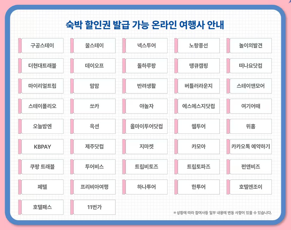 아직 정확한 명단이 발표되지 않았습니다. 2025년 2월 28일부터 42개 온라인 여행사에서 할인권 발급을 시작할 예정입니다.