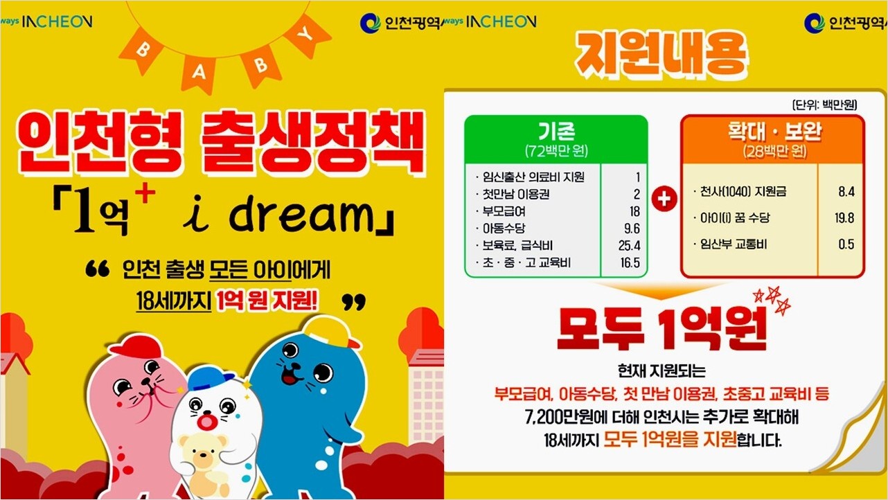 - 총 1억 원 지원 목표: 기존 정부의 지원금(약 7,200만 원)에 인천시가 추가로 2,800만 원을 더해, 아이가 태아부터 만 18세가 될 때까지 총 1억 원 상당의 지원을 제공하는 것을 목표로 합니다.
