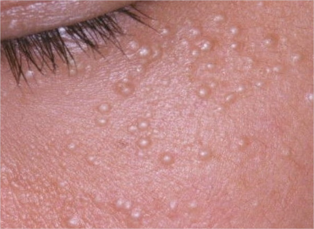 - 비립종: 피부 속에 각질 주머니가 생겨 흰색 또는 노란색의 좁쌀 모양으로 튀어나오는 것이 특징입니다. 주로 눈가에 많이 생기며, 손으로 짜려고 해도 잘 나오지 않고 상처만 남을 수 있습니다.