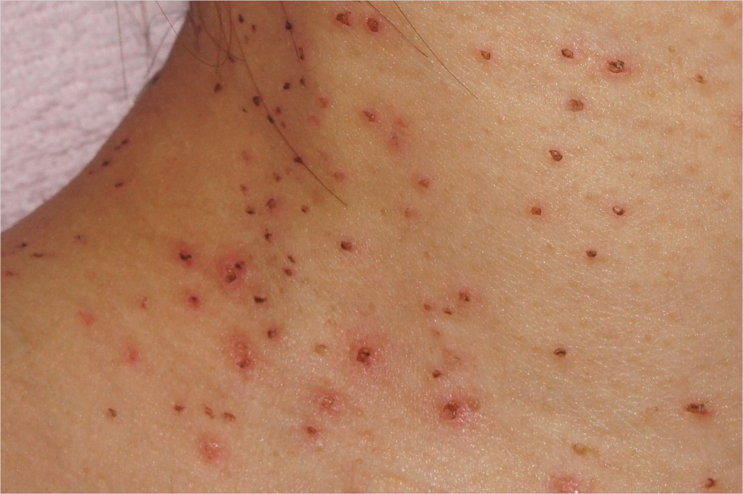 - 발생 부위: 주로 얼굴(특히 이마, 턱), 목, 팔, 손등, 다리 등 비교적 넓은 부위에 다발성으로 발생하며, 때로는 일직선으로 배열되기도 합니다.