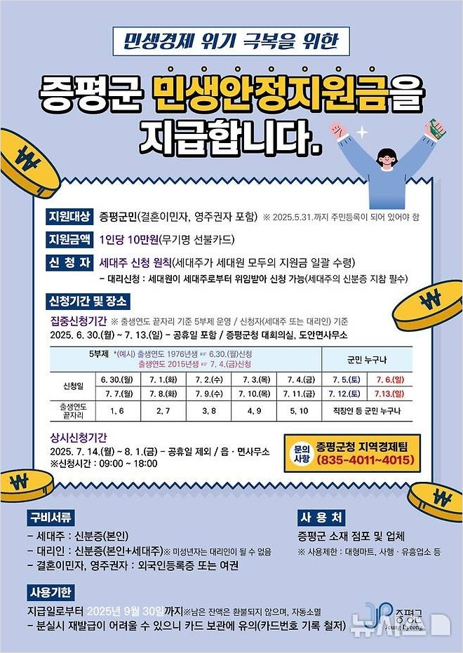 2025년 6월 1일 기준으로 주민등록상 주소지가 증평군인 모든 군민이 대상입니다. 외국인 주민도 포함되니 해당되시는 분들은 꼭 신청하세요!
