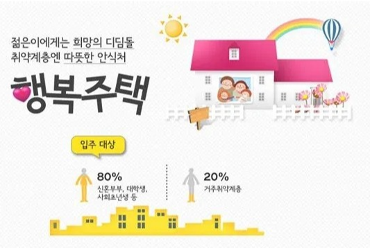 행복주택은 대학생, 청년, 신혼부부 등 젊은 계층과 고령자, 주거급여수급자 등 주거취약계층의 주거 안정을 위해 국가 재정과 주택도시기금의 지원을 받아 건설 또는 매입하여 주변 시세보다 20~40% 이상 저렴한 임대료로 공급하는 공공임대주택입니다.